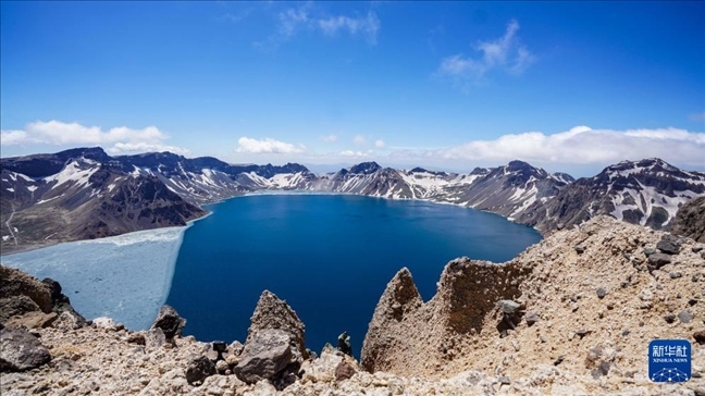近日,長(zhǎng)白山天池冰層逐漸消融,迎來(lái)“開(kāi)冰季”,吸引大量游客前來(lái)觀賞。