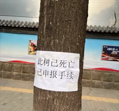 ·北京市民拍到一棵樹(shù)上貼著“死亡通知”,園林局工作人員:系正在等待砍伐許可的枯木。