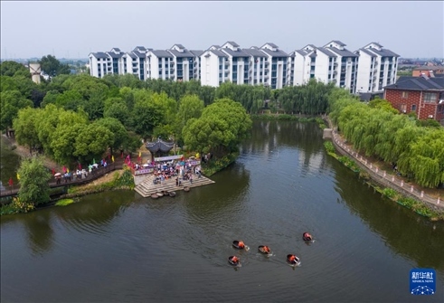當(dāng)日,浙江省湖州市吳興區(qū)東林鎮(zhèn)舉辦“慶端午 劃菱桶”水鄉(xiāng)端午趣味民俗活動(dòng),來(lái)自東林鎮(zhèn)各村的村民們?cè)谌娲鍏⒓恿怂l(xiāng)劃菱桶比賽、荷塘釣小龍蝦、做艾草花束、包粽子等端午趣味民俗活動(dòng),在初夏時(shí)節(jié)呈現(xiàn)江南水鄉(xiāng)特有的迎端午氣氛。
