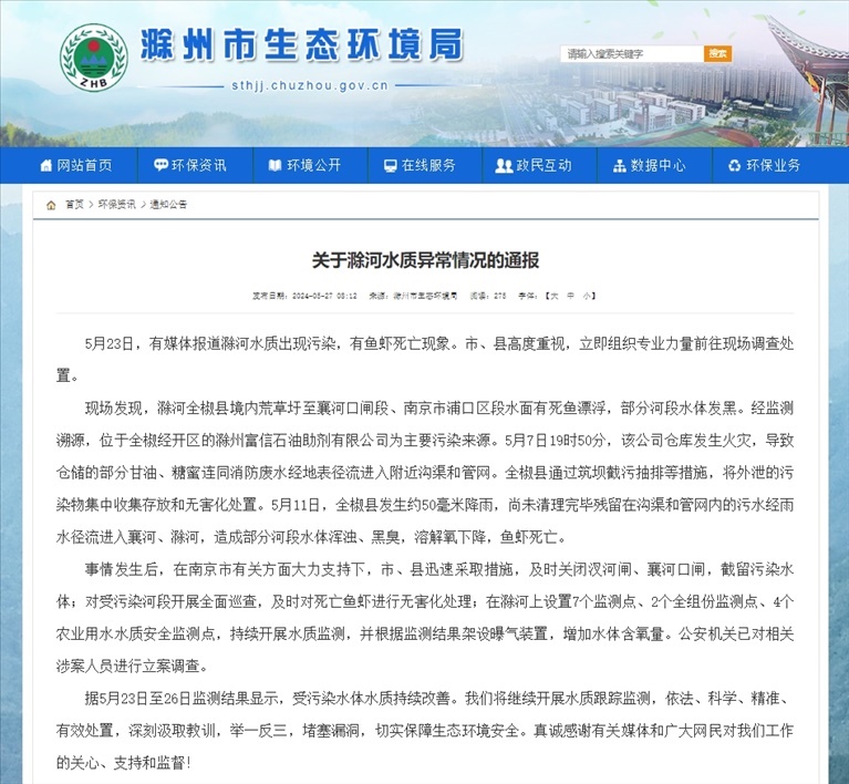 現(xiàn)場(chǎng)發(fā)現(xiàn),滁河全椒縣境內(nèi)荒草圩至襄河口閘段、南京市浦口區(qū)段水面有死魚漂浮,部分河段水體發(fā)黑。經(jīng)監(jiān)測(cè)溯源,位于全椒經(jīng)開區(qū)的滁州富信石油助劑有限公司為主要污染來(lái)源。5月7日19時(shí)50分,該公司倉(cāng)庫(kù)發(fā)生火災(zāi),導(dǎo)致倉(cāng)儲(chǔ)的部分甘油、糖蜜連同消防廢水經(jīng)地表徑流進(jìn)入附近溝渠和管網(wǎng)。全椒縣通過(guò)筑壩截污抽排等措施,將外泄的污染物集中收集存放和無(wú)害化處置。5月11日,全椒縣發(fā)生約50毫米降雨,尚未清理完畢殘留在溝渠和管網(wǎng)內(nèi)的污水經(jīng)雨水徑流進(jìn)入襄河、滁河,造成部分河段水體渾濁、黑臭,溶解氧下降,魚蝦死亡。公安機(jī)關(guān)已對(duì)相關(guān)涉案人員進(jìn)行立案調(diào)查。