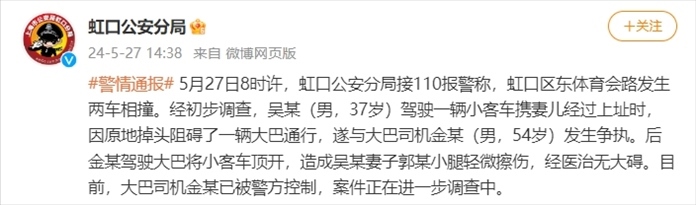 央視網消息:上海市公安局虹口分局發(fā)布警情通報,5月27日8時許,虹口公安分局接110報警稱,虹口區(qū)東體育會路發(fā)生兩車相撞。經初步調查,吳某(男,37歲)駕駛一輛小客車攜妻兒經過上址時,因原地掉頭阻礙了一輛大巴通行,遂與大巴司機金某(男,54歲)發(fā)生爭執(zhí)。后金某駕駛大巴將小客車頂開,造成吳某妻子郭某小腿輕微擦傷,經醫(yī)治無大礙。目前,大巴司機金某已被警方控制,案件正在進一步調查中。