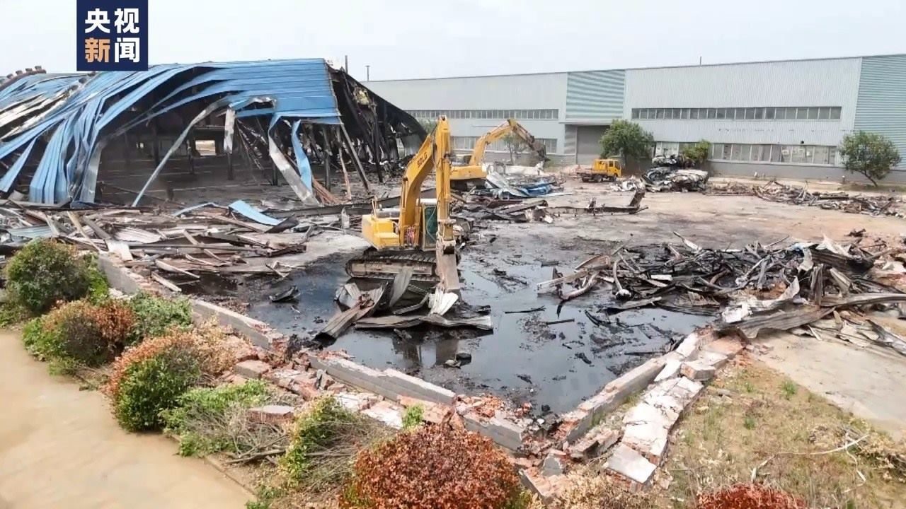 5月25日晚上7點多,總臺記者按照知情人的指引,趕往富信石油倉庫所在地,全椒經(jīng)開區(qū)經(jīng)二路東側的三期標準化廠房調(diào)查。此處共有6棟廠房,占地42畝,于2012年建成,廠房歸全椒百盛金屬科技有限公司所有,現(xiàn)租賃給當?shù)厮募移髽I(yè)使用。發(fā)生火災的2號廠房,目前已被部分拆解。環(huán)境監(jiān)測人員正在現(xiàn)場提取污水樣本。一旁的庫房內(nèi)仍然堆積了許多裝滿不明液體的塑料桶??諝庵袕浡瘫堑幕瘜W品氣味。