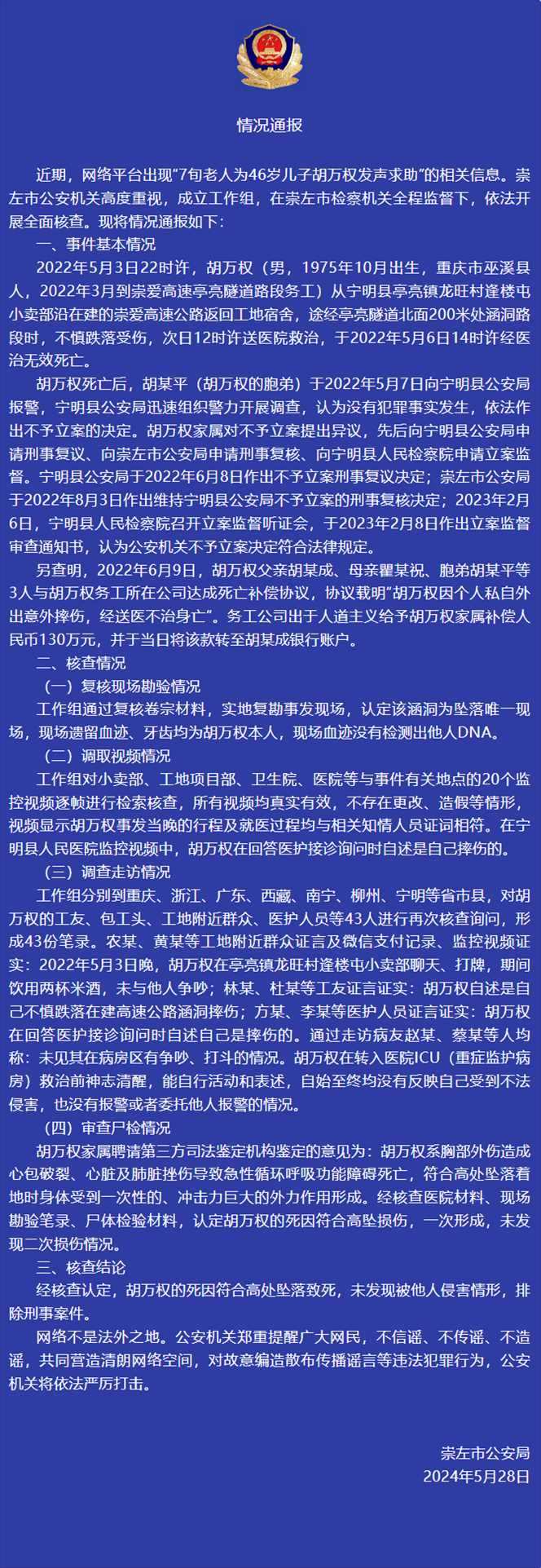 央視網(wǎng)消息:據(jù)“崇左警方”微信公眾號消息,廣西崇左市公安局5月28日通報,近期,網(wǎng)絡(luò)平臺出現(xiàn)“7旬老人為46歲兒子胡萬權(quán)發(fā)聲求助”的相關(guān)信息。崇左市公安機(jī)關(guān)高度重視,成立工作組,在崇左市檢察機(jī)關(guān)全程監(jiān)督下,依法開展全面核查?,F(xiàn)將情況通報如下: