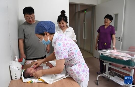 6月1日,在西安國際醫(yī)學(xué)中心醫(yī)院新生兒科病房,護士幫助新生兒翻身。