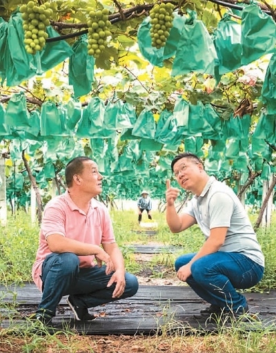 陳李波(右)在崇賢村葡萄種植園與農(nóng)戶一起察看葡萄長(zhǎng)勢(shì)。錢麗君攝