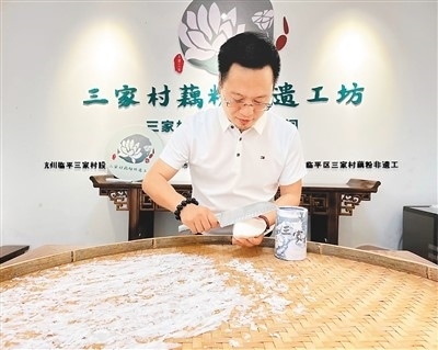 吳景順在三家村藕粉非遺工坊體驗(yàn)手削藕粉傳統(tǒng)技藝。袁 昕攝