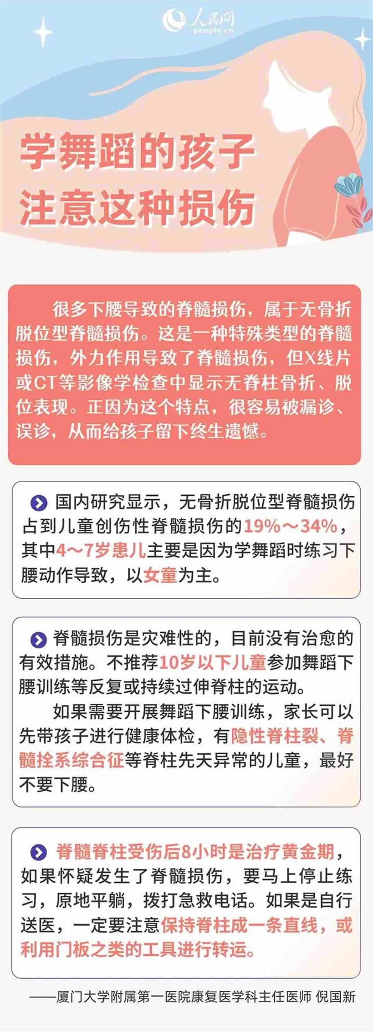 廈門(mén)大學(xué)附屬第一醫(yī)院康復(fù)醫(yī)學(xué)科主任醫(yī)師倪國(guó)新對(duì)記者表示,兒童練習(xí)舞蹈雖然好處多多,但需要注意的是,下腰、壓腿等動(dòng)作存在一定的危險(xiǎn)性,嚴(yán)重的甚至?xí)?dǎo)致截癱,在練習(xí)過(guò)程中要謹(jǐn)防脊髓損傷。