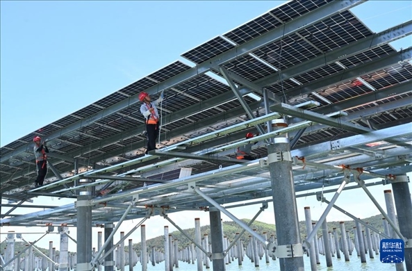 6月20日,施工人員在海上光伏電站現(xiàn)場安裝支架和光伏組件。