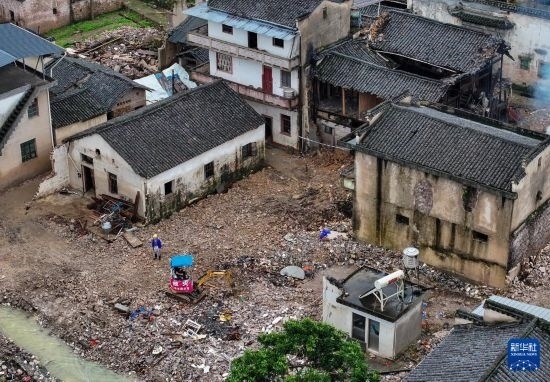 6月28日,工作人員在黃山市歙縣溪頭鎮(zhèn)進(jìn)行災(zāi)后清理工作(無(wú)人機(jī)照片)。
