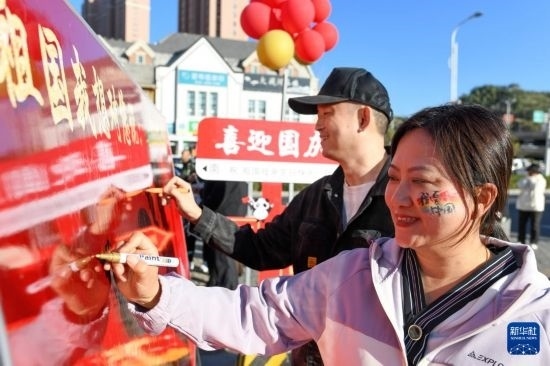 9月29日,烏魯木齊市水磨溝區(qū)水磨溝街道北山社區(qū)居民在心愿墻上寫下對(duì)祖國的祝福。