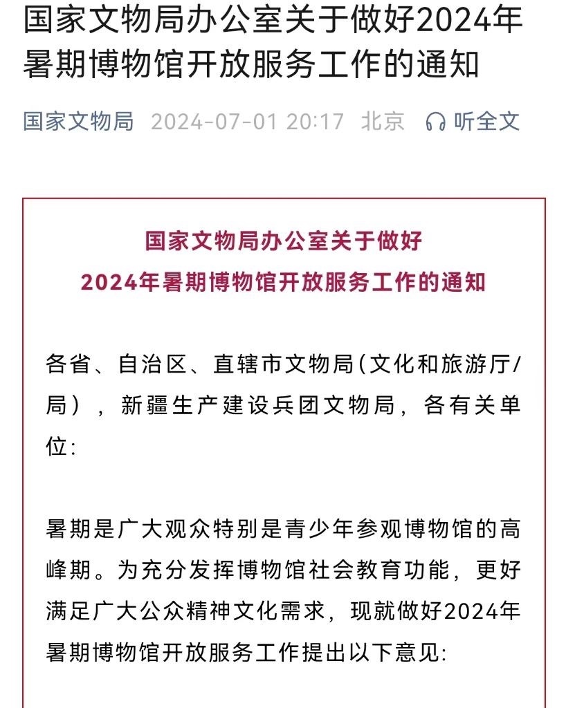 國(guó)家文物局7月1日發(fā)出通知,就做好2024年暑期博物館開放服務(wù)工作進(jìn)行部署。通知明確,各級(jí)文物行政主管部門要加強(qiáng)指導(dǎo),科學(xué)評(píng)估場(chǎng)館承載量,創(chuàng)新舉措,通過(guò)多種方式提高觀眾參觀博物館便利化水平。