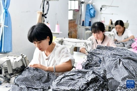 7月5日,在嘉祥縣馬村鎮(zhèn)昕銳克萊“共富工坊”,村民在加工外單成衣。