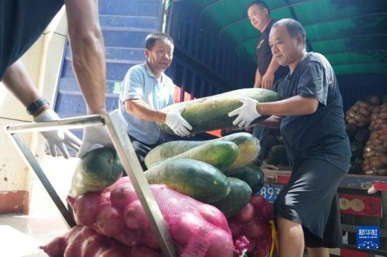 7月7日,工作人員在華容縣職業(yè)中專安置點(diǎn)搬運(yùn)社會(huì)捐贈(zèng)的農(nóng)產(chǎn)品。