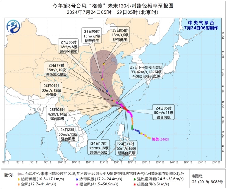大風(fēng)預(yù)報(bào):7月24日08時(shí)至25日08時(shí),黃海西南部、東海大部及釣魚島附近海域、臺(tái)灣海峽、臺(tái)灣以東洋面、巴士海峽、南海大部、臺(tái)灣島沿海、浙江沿海、福建沿海、江蘇東南部沿海、上海沿海、長(zhǎng)江口區(qū)、杭州灣將有7-9級(jí)大風(fēng),其中東海南部及釣魚島附近海域、臺(tái)灣以東洋面、臺(tái)灣島東部和北部沿海、福建中北部沿海的風(fēng)力有10-12級(jí),“格美”中心經(jīng)過的附近海面或地區(qū)的風(fēng)力有13-16級(jí),陣風(fēng)17級(jí)以上。