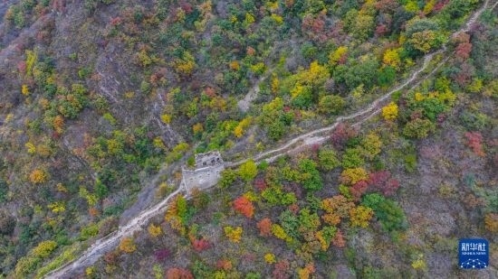 10月18日在河北省遷西縣上營(yíng)鎮(zhèn)青山關(guān)長(zhǎng)城景區(qū)拍攝的秋景(無(wú)人機(jī)照片)。