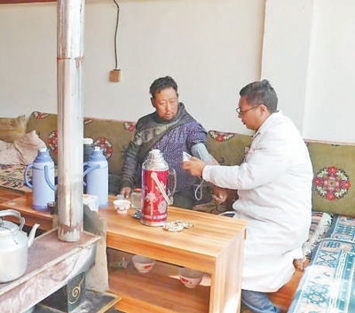 達頓(右)入戶為群眾檢查身體。次仁多吉攝