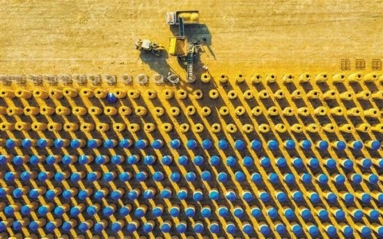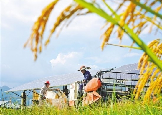 10月15日,浙江省樂清市勝利塘內(nèi)的“農(nóng)光互補(bǔ)”光伏發(fā)電項(xiàng)目基地,農(nóng)戶將收割好的稻谷裝袋。蔡寬元攝(中經(jīng)視覺)
