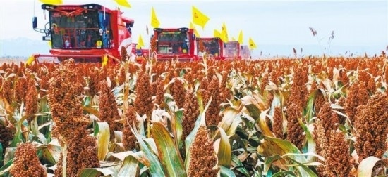 10月16日,甘肅省張掖市民樂縣有機(jī)紅高粱種植基地,大型收割機(jī)在收割高粱。王 將攝(中經(jīng)視覺)