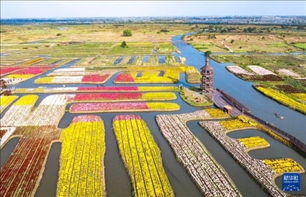 10月25日,游客在江蘇省興化市千垛景區(qū)賞菊游玩(無人機(jī)照片)。