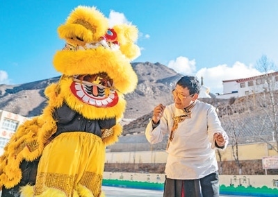 凝聚人心融合了漢藏特色表演形式的碩督鎮(zhèn)獅子舞,見證著西藏各民族交往交流交融的歷史。鄧巴阿尼是西藏昌都市非物質(zhì)文化遺產(chǎn)碩督鎮(zhèn)獅子舞的傳承人,近年來致力于獅子舞傳承。圖為鄧巴阿尼(右)在昌都市洛隆縣碩督鎮(zhèn)小學指導學生跳獅子舞。新華社記者 丁增尼達攝