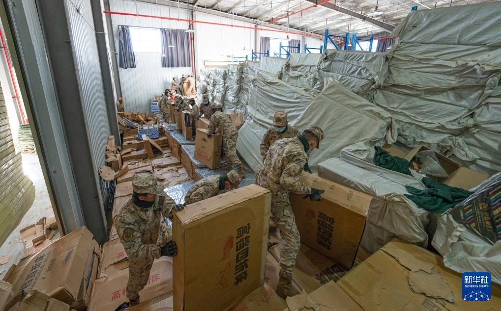1月8日,在日喀則市經(jīng)開區(qū)物資儲備倉庫,武警官兵在搬運抗震救災物資。