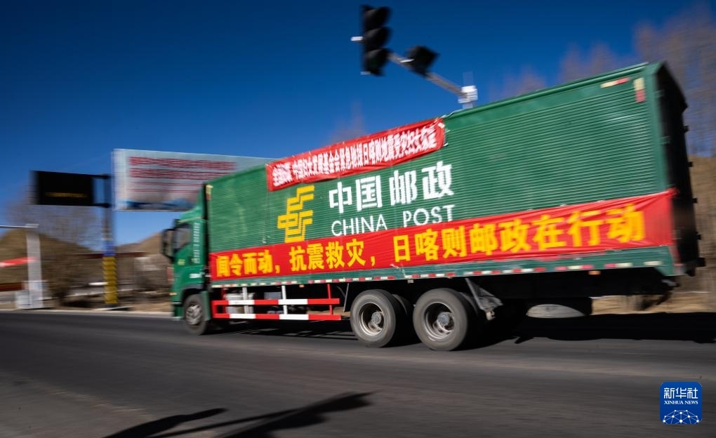1月8日,在日喀則市境內的318國道旁,中國郵政的抗震救災物資運輸車輛向震中方向駛去。