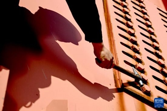 “鐺……鐺……鐺……”,在鄭焦城際鐵路黃河大橋的鋼梁洞之間,橋梁工們拿著檢查錘、敲擊著螺栓,通過聲音判斷大橋有沒有安全隱患。這樣的螺栓,在全長11.3公里的鄭焦城際鐵路黃河大橋上,有將近10萬顆。