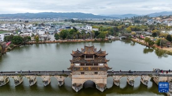 2月3日,游客在云南省建水縣雙龍橋游覽(無人機照片)。