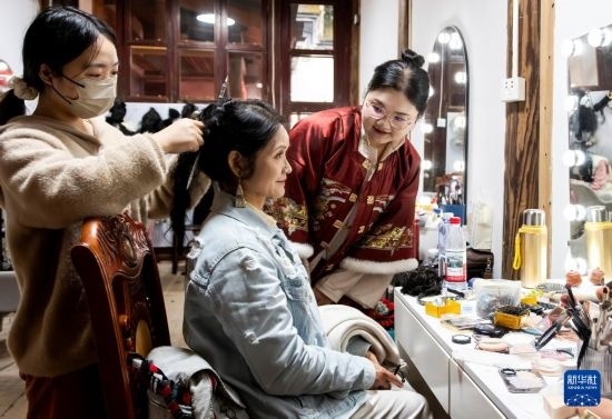 2月3日,在福州三坊七巷一處“三條簪”化妝跟拍點,化妝師在為來自上海的母女進行“三條簪”妝造。