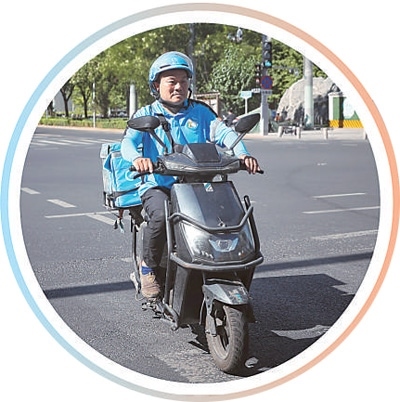 外賣騎手丁書(shū)會(huì)在送單途中。