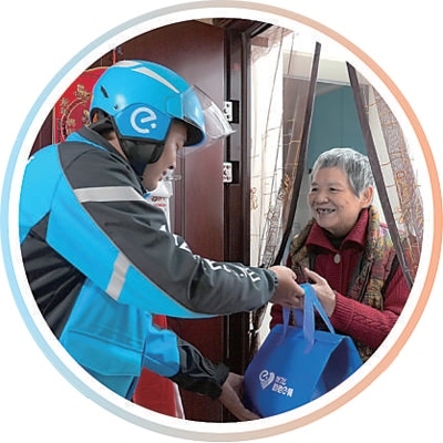 外賣騎手張魁在社區(qū)開(kāi)展助老送餐服務(wù)。
