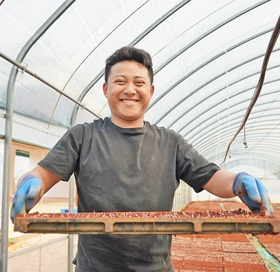 種好超級(jí)雜交水稻,秧苗質(zhì)量很重要。農(nóng)技人員要提前浸種、曬種,防治多種傳染病害。在基地,農(nóng)戶(hù)也早早準(zhǔn)備了育秧材料。倒入基質(zhì)土、送入秧盤(pán)、鋪土、澆水、撒種、蓋土……一系列工序后,育秧盤(pán)送入暗室催芽,再過(guò)兩天,擺進(jìn)溫室大棚。