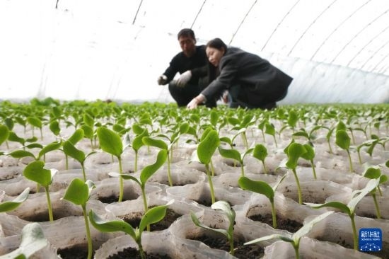 3月20日,在黑龍江省北安市通北鎮(zhèn)東北亞現(xiàn)代蔬菜產(chǎn)業(yè)園溫室大棚內(nèi),技術(shù)人員(右)在指導種植戶管理黃瓜苗。