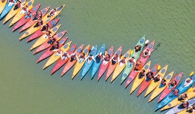 4月25日,重慶市南川區(qū)黎香湖鎮(zhèn)黎香湖皮劃艇基地,游客們在湖里體驗水上運(yùn)動樂趣。據(jù)介紹,“五一”假期期間該皮劃艇基地已預(yù)約滿員。