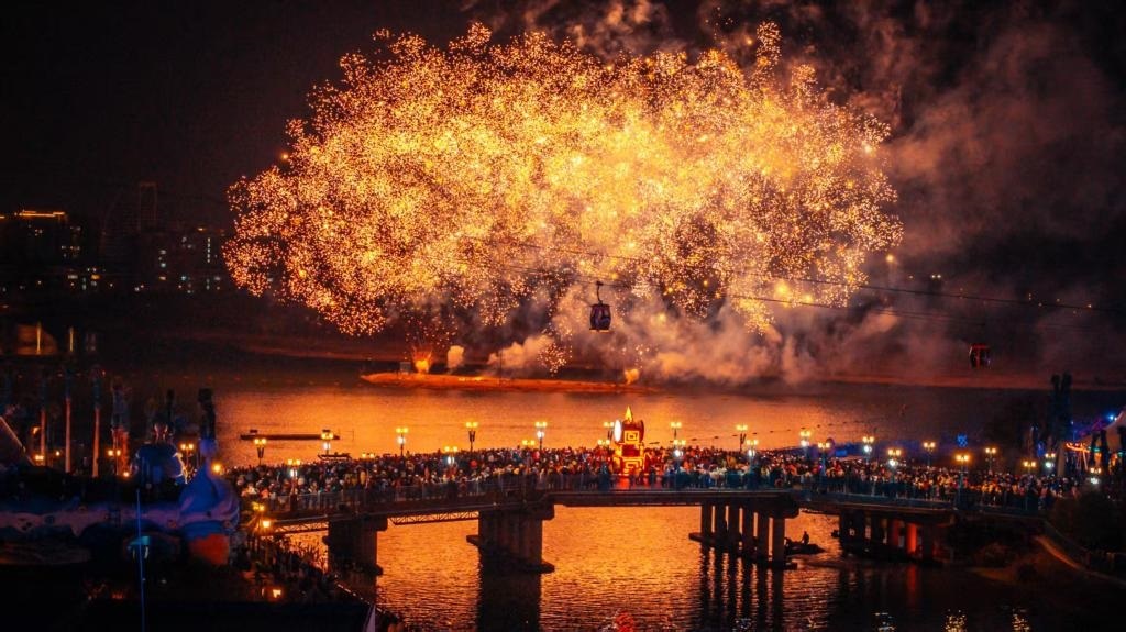 5月1日晚,游客在上海海昌海洋公園觀賞煙花秀。(上海海昌海洋公園供圖)