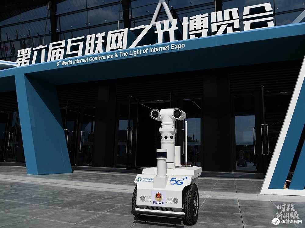 △這是“互聯(lián)網(wǎng)之光”博覽會(huì)展館前的5G警用機(jī)器人。