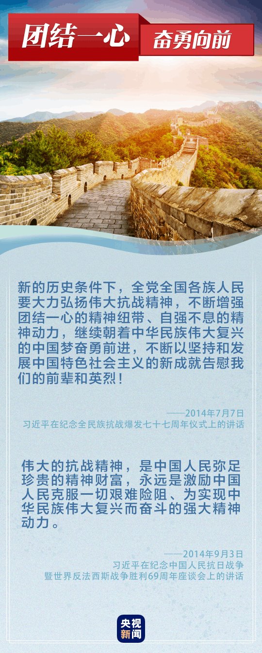 “偉大的抗戰(zhàn)精神,永遠是激勵中國人民克服一切艱難險阻、為實現(xiàn)中華民族偉大復興而奮斗的強大精神動力。”“正義必勝!和平必勝!人民必勝!”黨的十八大以來,習近平總書記多次談到抗戰(zhàn)精神。讓我們重溫總書記重要論述,銘記歷史、奮勇向前。