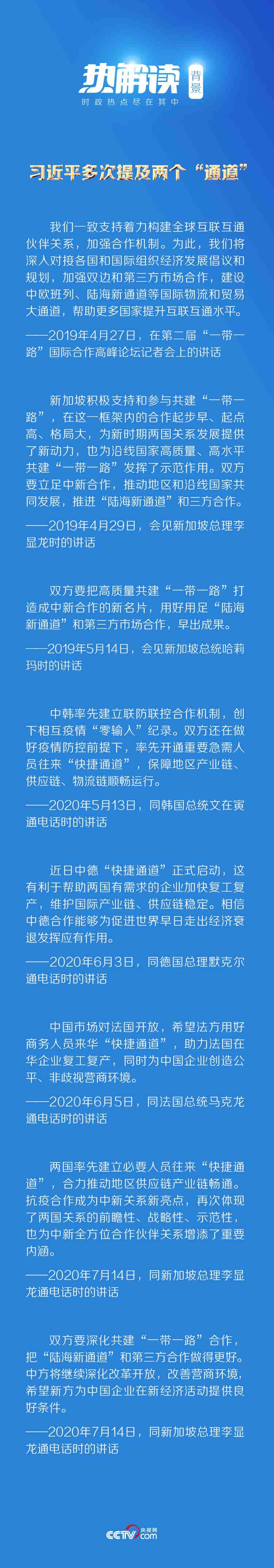 7月14日,習近平主席同新加坡總理李顯龍通電話。他在通話中表示,“疫情發(fā)生以來,中新兩國政府和各界互施援手,守望相助”,并特別提到了“快捷通道”和“陸海新通道”這兩條“通道”。