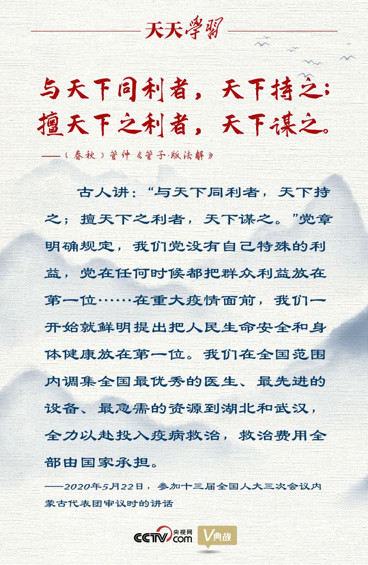 “不惜一切代價!”2020年5月22日,習(xí)近平總書記參加十三屆全國人大三次會議內(nèi)蒙古代表團(tuán)審議,在談及保護(hù)人民生命安全和身體健康時擲地有聲地說。他在此引用了“與天下同利者,天下持之;擅天下之利者,天下謀之”這句古語,強(qiáng)調(diào)我們黨沒有自己特殊的利益,黨在任何時候都把群眾利益放在第一位。這是我們黨作為馬克思主義政黨區(qū)別于其他政黨的顯著標(biāo)志。