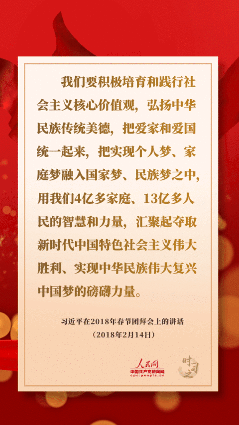 我們要積極培育和踐行社會主義核心價值觀,弘揚(yáng)中華民族傳統(tǒng)美德,把愛家和愛國統(tǒng)一起來,把實現(xiàn)個人夢、家庭夢融入國家夢、民族夢之中,用我們4億多家庭、13億多人民的智慧和力量,匯聚起奪取新時代中國特色社會主義偉大勝利、實現(xiàn)中華民族偉大復(fù)興中國夢的磅礴力量。