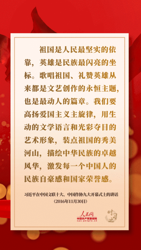 祖國是人民最堅實的依靠,英雄是民族最閃亮的坐標(biāo)。歌唱祖國、禮贊英雄從來都是文藝創(chuàng)作的永恒主題,也是最動人的篇章。我們要高揚(yáng)愛國主義主旋律,用生動的文學(xué)語言和光彩奪目的藝術(shù)形象,裝點(diǎn)祖國的秀美河山,描繪中華民族的卓越風(fēng)華,激發(fā)每一個中國人的民族自豪感和國家榮譽(yù)感。