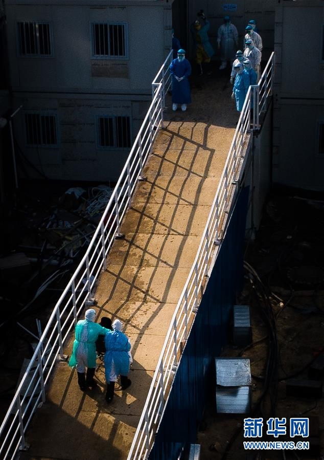 醫(yī)護(hù)人員將患者送入武漢火神山醫(yī)院病房(2020年2月4日攝,無人機照片)。新華社記者肖藝九攝
