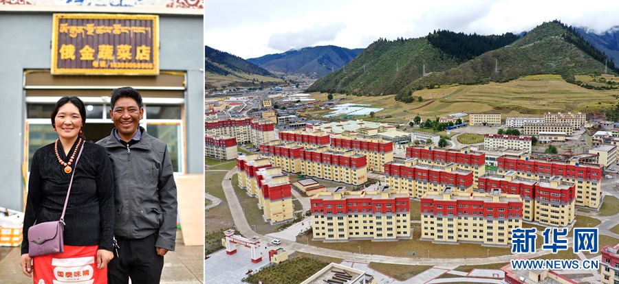 2020年9月22日拍攝的拼版照片:左圖為西藏自治區(qū)昌都市類烏齊縣長毛嶺鄉(xiāng)達(dá)雄村村民俄金(右)和妻子阿丁在安置點俄金蔬菜店前;右圖為類烏齊縣桑多扶貧開發(fā)區(qū)易地扶貧搬遷安置點一角(無人機照片)。新華社記者詹彥攝