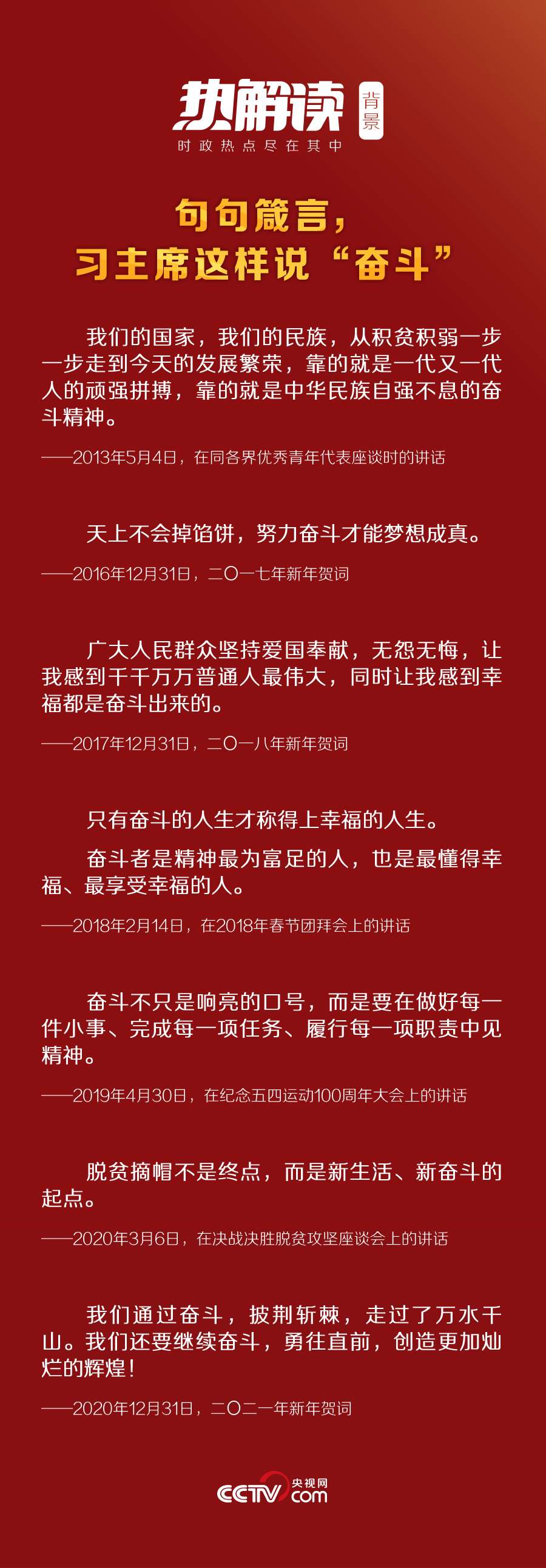 2020年,“十三五”圓滿收官,“十四五”全面擘畫(huà);2021年,既是“十四五”開(kāi)局之年,又是“兩個(gè)一百年”的歷史交匯點(diǎn),全面建設(shè)社會(huì)主義現(xiàn)代化國(guó)家新征程即將開(kāi)啟。在這個(gè)關(guān)鍵節(jié)點(diǎn)再次強(qiáng)調(diào)“奮斗”,習(xí)近平主席意蘊(yùn)深遠(yuǎn)。