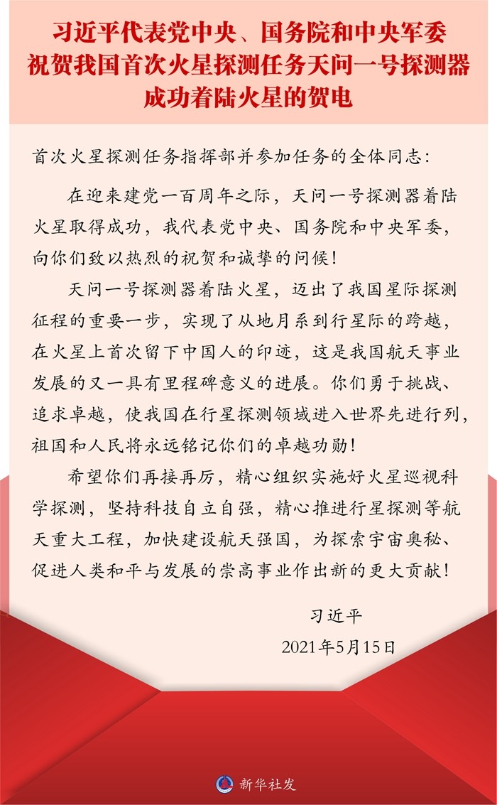 【學(xué)習(xí)進(jìn)行時】5月15日,我國首次火星探測任務(wù)著陸火星取得成功。習(xí)近平總書記致賀電,向首次火星探測任務(wù)指揮部并參加任務(wù)的全體同志致以熱烈的祝賀和誠摯的問候。新華社《學(xué)習(xí)進(jìn)行時》原創(chuàng)品牌欄目“講習(xí)所”今天推出文章,為您解讀。