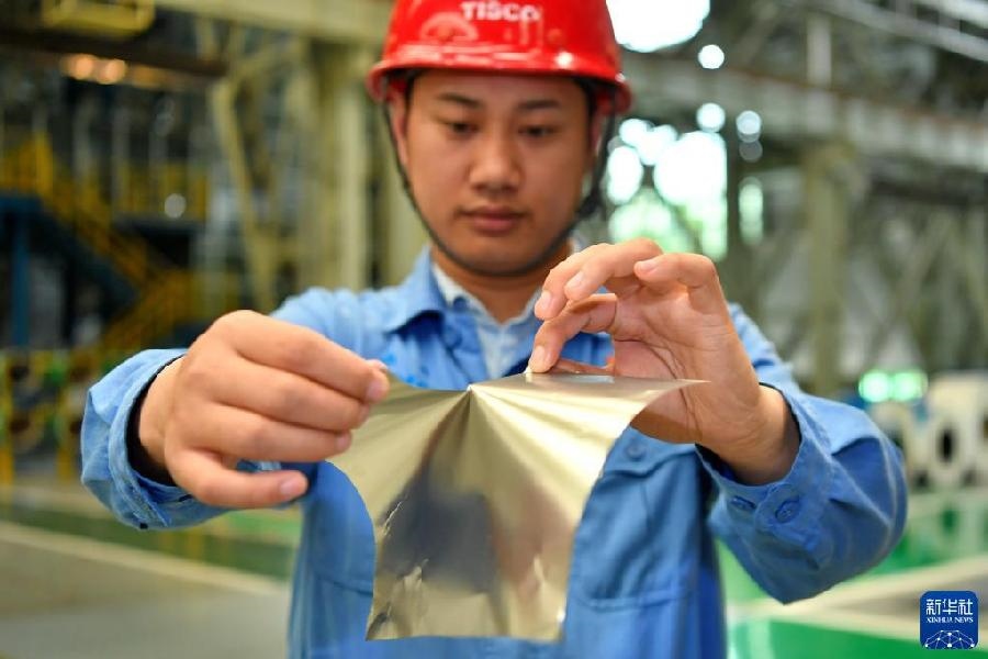在位于山西的太鋼集團,員工展示用手撕開0.02毫米厚的超薄帶狀不銹鋼(2019年5月24日攝)。新華社記者 曹陽 攝