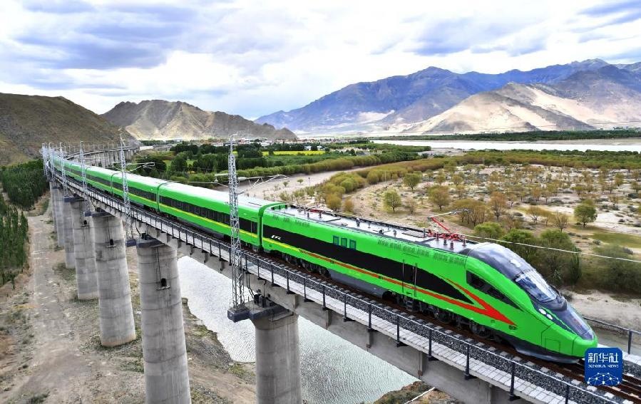 這是試運行的復興號列車行駛在西藏山南市境內(6月16日攝)。6月25日,全長435公里、設計時速160公里的拉林鐵路建成通車,西藏首條電氣化鐵路建成,同時復興號實現(xiàn)對31個省區(qū)市全覆蓋。新華社記者