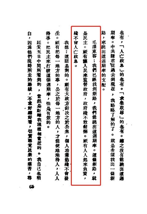 在黃炎培看來(lái),“這話是對(duì)的”,因?yàn)椤爸挥邪衙恳坏胤降氖?,公之于每一地方的人,才能使地地得人,人人得事。用民主?lái)打破這周期率,怕是有效的”。