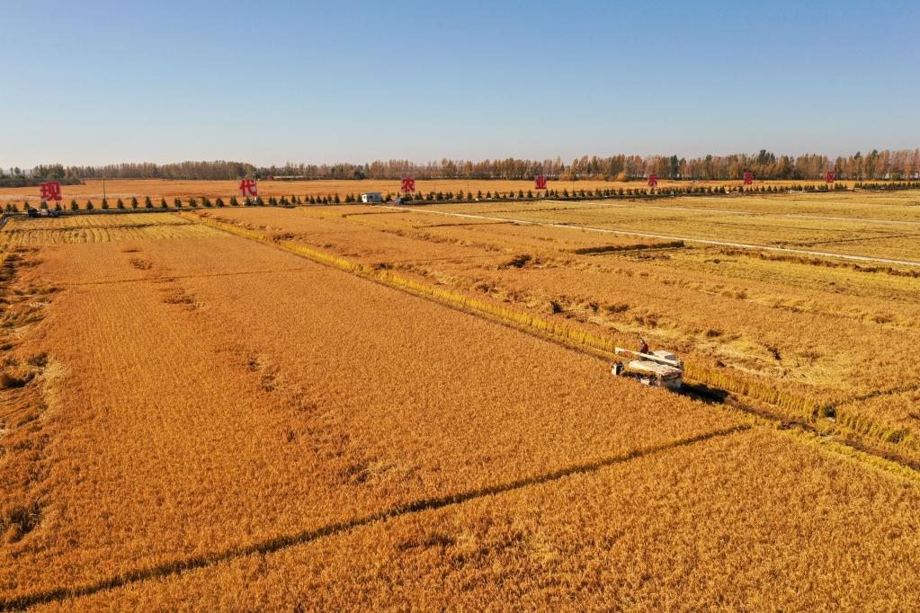 2021年10月12日,在吉林省吉林市永吉縣萬昌鎮(zhèn),農(nóng)民駕駛農(nóng)機收割水稻(無人機照片)。新華社記者張楠攝