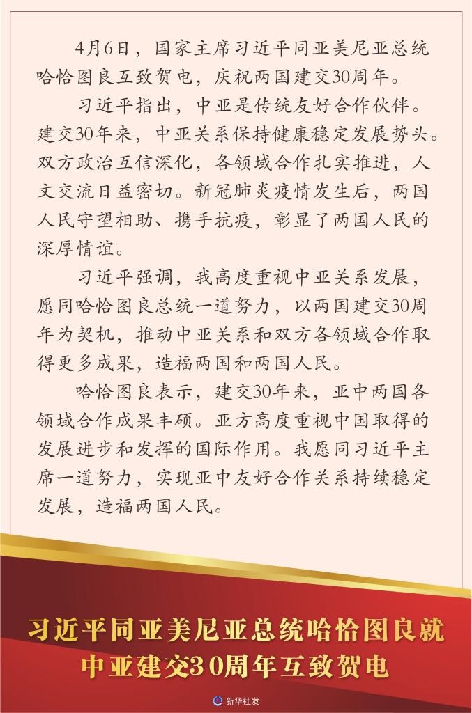 習(xí)近平強(qiáng)調(diào),我高度重視中亞關(guān)系發(fā)展,愿同哈恰圖良總統(tǒng)一道努力,以兩國建交30周年為契機(jī),推動中亞關(guān)系和雙方各領(lǐng)域合作取得更多成果,造福兩國和兩國人民。